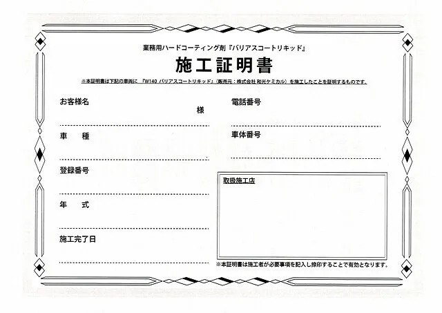 施工して頂いたお車にはコーティング施工証明書を発行させて頂きます。