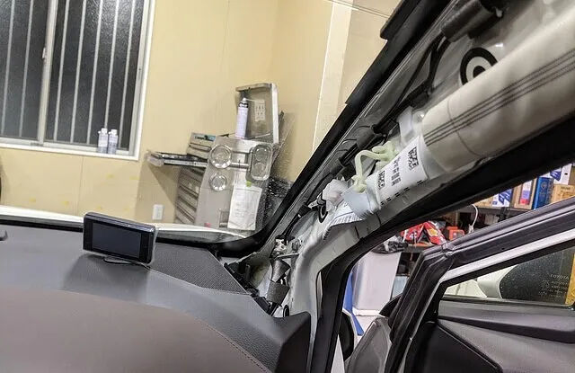 本体はダッシュボード運転席側端へ取り付け、ピラーカバーを外して配線を足元に持って行きます