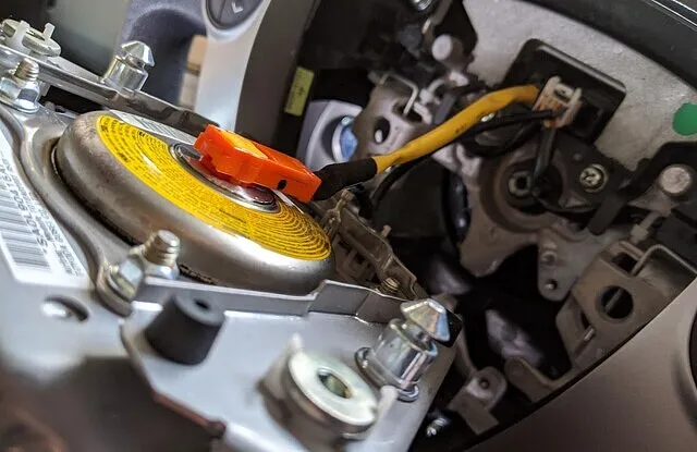 エアバッグを取り外すのでバッテリーのマイナスターミナルを外しておきます