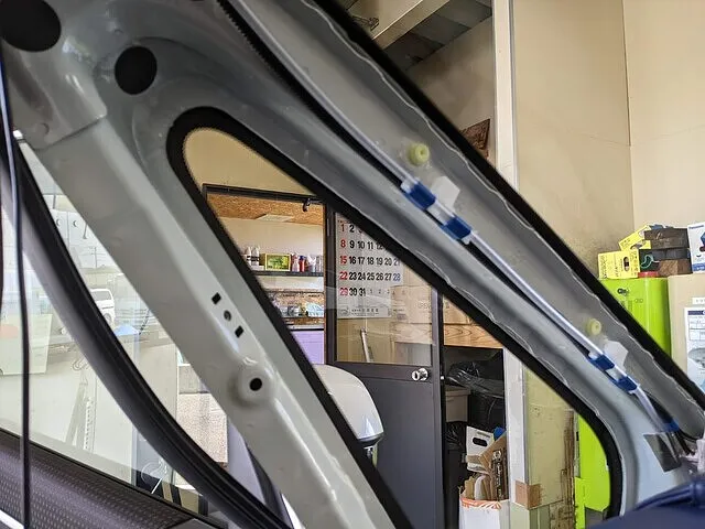 フリップダウンモニターのドア連動イルミの配線や映像と電源配線を通す為にトリムを外していきます。
