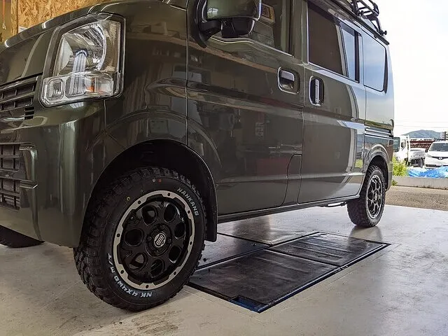 DA17V エブリイバンにアップサスとタイヤホイール取り付けで入庫です。
