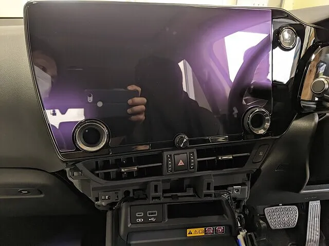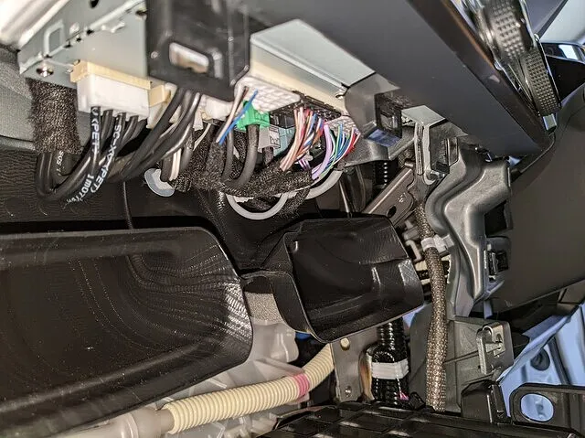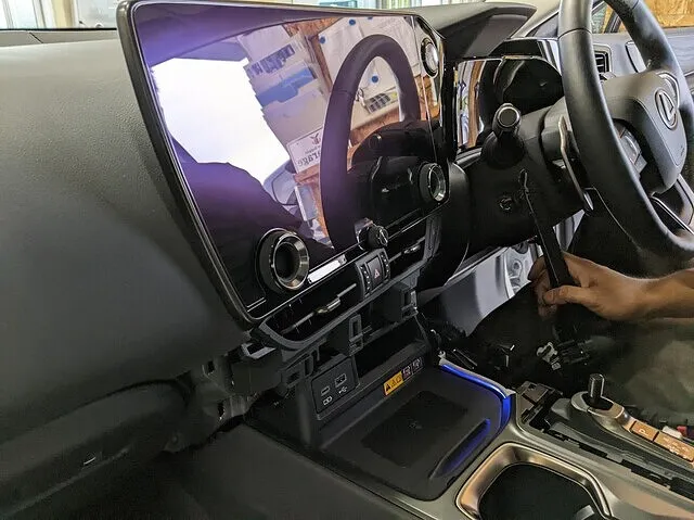 通常のテレビキットはモニターを取り外してその裏に取り付ける事が多いのですがNXはエアコン吹出口の上にカプラーが見えていて、そこにキットを取り付けます。