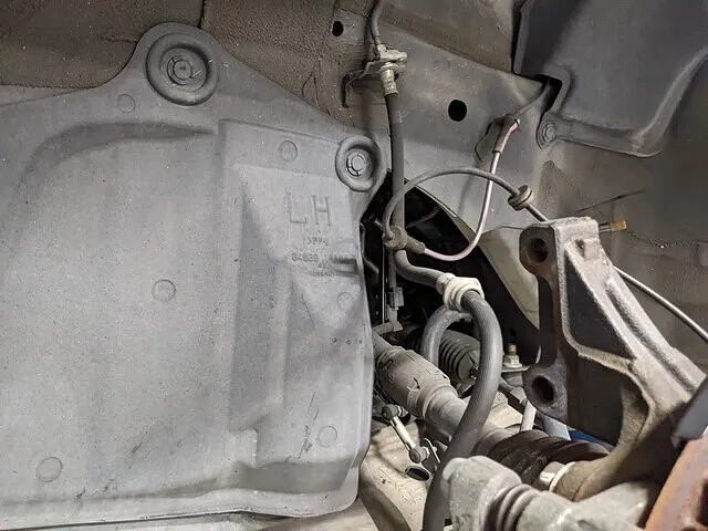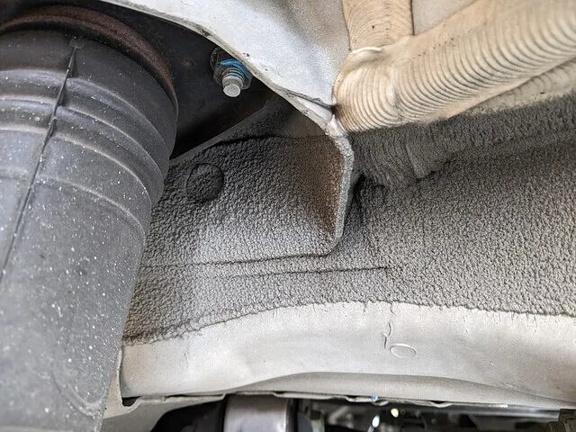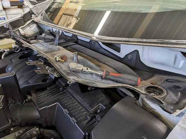 フロント側のアッパーマウントのボルトを外す為にサービスホールもあったのですが脱着しにくそうだったのでワイパーカウルを取り外して作業する事にしました