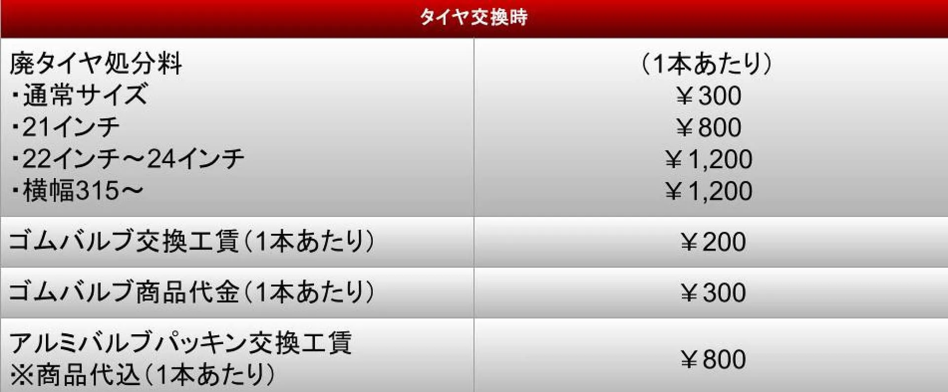 ※バーストタイヤ、ワイヤーが露出したタイヤ等は1本あたり追加料金¥500