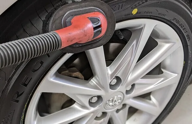 お持ちいただいたホイールとタイヤを組み付け車両に装着しているタイヤホイールと交換していきます